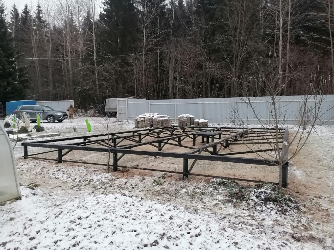 Фундамента на сваях в зимний период - 40 винтовых свай с укосинами и обвязкой швеллером